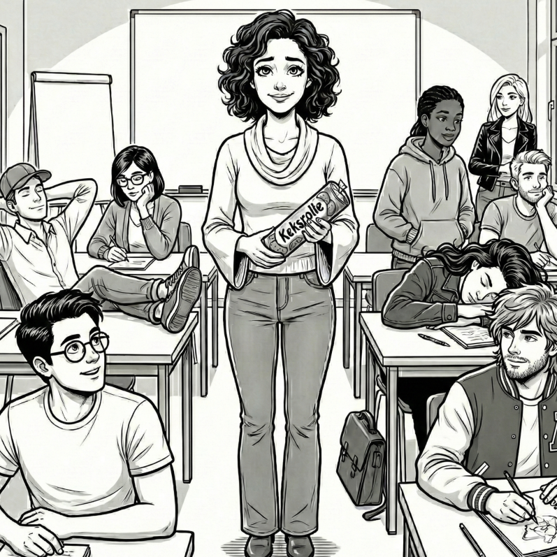 A. Kelly: (Schmunzelt) Definitiv nicht beim Theorie-Gott. Der weiß nur aus Büchern, wie alles geht, hat es aber nicht mal ansatzweise wirklich gemacht. Ich bin eher die „Pragmatikerin des Chaos“. Ich bewundere die „Rampensau“, die auf der Bühne glänzt, aber mein natürlicher Lebensraum ist das Seminar, wo Dinge schiefgehen müssen. Wenn der Beamer nicht funktioniert und wir trotzdem weitermachen – das ist meine Bühne. Sagen wir so: Ich bin die, die den Karren aus dem Dreck zieht, während der Theorie-Gott noch berechnet, wie tief der Dreck eigentlich ist und ob er darin versinkt.